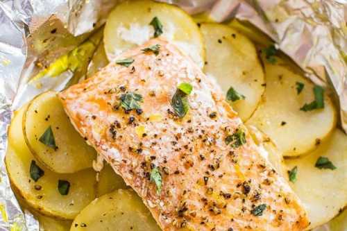 Приготування: Замаринуй сьомгу в спеціях, лимонному соку та ложці олії на 20 хвилин. Виклади тонко нарізану картоплю на змащену олією, що залишилася, форму, а на неї – слайси часнику і посип все спеціями. Зверху додай стейки сьомги та по скибочці вершкового масла. Знову присип спеціями, влий воду і накрий фольгою. Відправте блюдо в духовку на півгодини при 200 градусах, після чого зніміть фольгу і запікайте ще 10-12 хвилин.