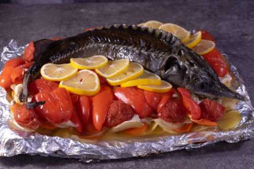 Тобі знадобиться: 1 стерлядь, 1 лимон, 1 пучок зелені, 100 мл оливкової олії, 100 г помідорів чері, 2 моркви, 1 болгарський перець, 1 цибулина, 1 кабачок, 1 баклажан, спеції.