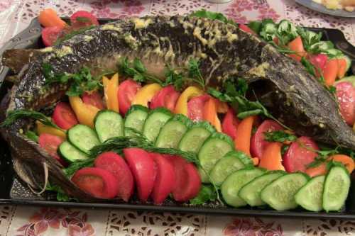Приготування: Очисти стерлядь, збризкати її лимонним соком, натрій спеціями і вклади зелень всередину. Довільно наріж овочі, виклади все у форму та полів оливковою олією. Запікайте близько 40 хвилин під фольгою при 180 градусах.