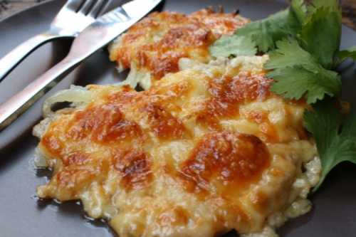 Приготування: Наріж цвітну капусту пластинами по 10-15 мм і виклади на змащений лист. Наріж курку на відбивні, відбий, приправ і додай зверху. Змішай майонез, гірчицю та тертий сир, і теж виклади зверху. Запікайте страву 40 хвилин у духовці при 180 градусах.