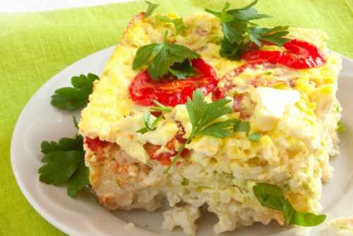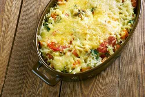 Приготування: Промий рис, довільно наріж овочі, натрій сир і подрібни часник із зеленню. Обсмажити цибулю з перцем у маслі до м'якості. Відварити рис до напівготовності. Змішай разом всі інгредієнти та виклади у форму для запікання. Відправте на півгодини в духовку при 180 градусах.