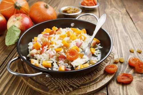 Приготування: Промий та подрібни сухофрукти. Яблуко, грушу та моркву наріж дрібним кубиком. Обсмаж моркву пару хвилин до м'якості і додай свіжі та сухі фрукти. Жар ще трохи, помішуючи. Всип помитий рис і смажу ще 1 хвилину. Додай гарячу воду та спеції за смаком. Туши гарнір під кришкою 20 хвилин на слабкому вогні.