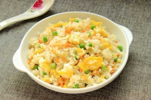 Приготування: Відварити рис до готовності. Віночком збий яйця зі спеціями. Подрібни часник, обсмаж його в невеликій кількості олії і влий туди яйце. Перемішати омлет, щоб він смажився шматочками. Коли він трохи схопиться, додай горошок і готуй кілька хвилин, помішуючи. Додай рис та соєвий соус, перемішай і прогрій блюдо ще пару хвилин.