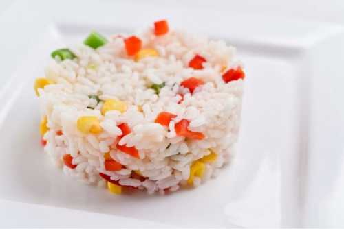 Тобі знадобиться: 160 г рису, 1 морква, 1/2 цибулини, 65 г зеленого горошку, 1/2 болгарського перцю, 65 г кукурудзи, ароматні трави, спеції.