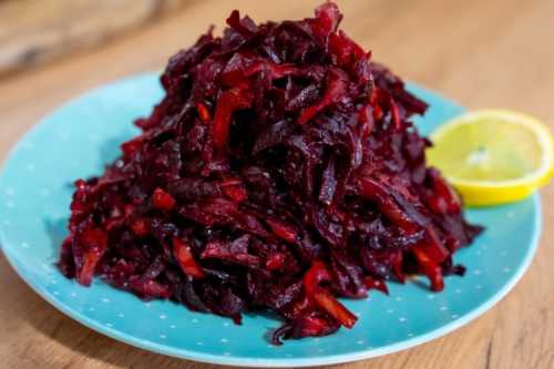 Приготування: Запекти або відварити буряк і наріж його соломкою. Обсмаж подрібнену цибулю в маслі пару хвилин, додай буряк і ще через 2 хвилини – віджату і нарізану капусту. Додай томатну пасту та спеції, і туши все під кришкою до бажаної м'якості.
