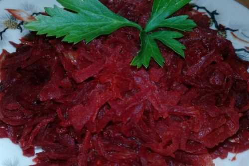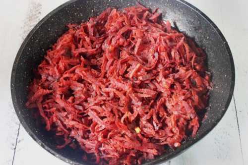 Приготування: Буряки відваріть до готовності і натрій на тертці. Дрібно наріж і обсмаж цибулю в олії. Додай буряк, терте яблуко та спеції. Туши всі разом 10-15 хвилин на слабкому вогні.