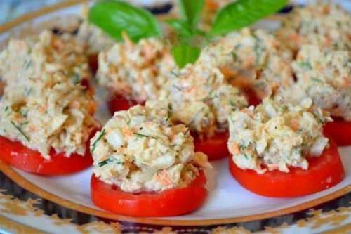 Приготування: Виделкою розімні консервованого тунця, натрі моркву та яблуко на тертці, подрібни цибулю та зелень, і змішай все з майонезом. Наріж помідори на кружечки і виклади на них начинку.