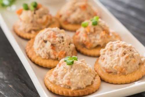 Приготування: Виделкою розімніть тунця і змішай його з вершковим сиром і дрібно нарізаною фіолетовою цибулею. Виклади цю начинку на крекери та прикрась зеленню.