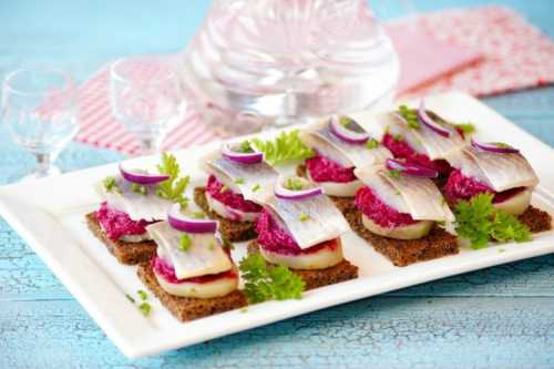 Приготування: Відвари і натрій буряк на тертці, а потім змішай її з оливковою олією, лимонним соком, зернистою гірчицею та спеціями. Відвари і наріж яйця кружальцями, а хліб – наріж і підсуши на сковороді або в духовці. Розклади кружечки яєць на хліб, далі додай буряк і зверху оселедця. Прикрась готові канапе тонким пір'ям фіолетової цибулі.
