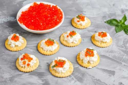 Приготування: Змішай м'яке вершкове масло, вершковий сир, спеції та подрібнену зелень. Гарно виклади цю начинку на крекери і потім прикрась червоною ікрою закуску.