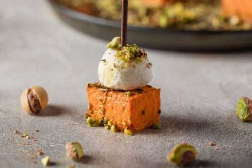 Приготування: Наріж гарбуз середніми кубиками, змішай їх з оливковою олією, спеціями та травами, та запікай 15 хвилин у духовці при 190 градусах. Збий вершковий сир, гарно виклади його на гарбуз і посип рубаними горіхами.