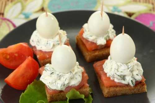 Приготування: Змішай сирний сир, подрібнений кріп та спеції. Наріж хліб, підсуши його в духовці і виклади зверху по шматочку червоної риби. Після чого додай сирний сир із зеленню, прикрась канапе перепелиними яйцями та зафіксуй шпажками.
