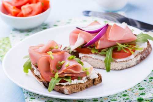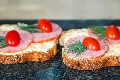 Приготування: Змішай сирний сир з рубаною зеленню і змасти хліб. Виклади зверху нарізані кружальцями помідори та скибочки ковбаси.