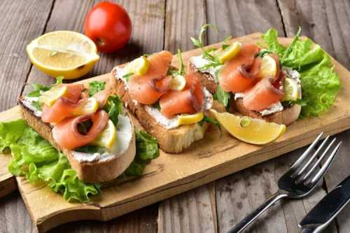 Приготування: Змасти хліб сирним сиром і виклади зверху сьомгу. На неї виклади каперси, кільця маслин, тонкі скибочки лимона і посип все рубаним кропом.