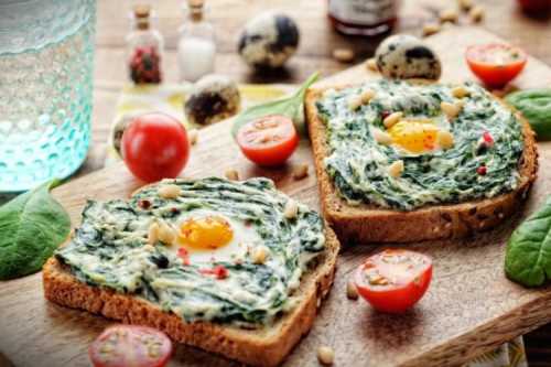 Тобі знадобиться: 2 скибочки хліба, 70 г сирного сиру, 1 жменю шпинату, 2 перепелині яйця, 1 жменю кедрових горішків.
