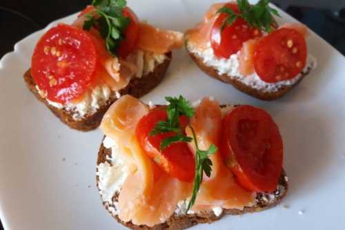 Тобі знадобиться: 4 шматочки хліба, 150 г червоної риби, 4 помідори чері, 120 г сирного сиру, 1 жменю руколи, маслини.