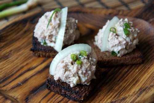 Тобі знадобиться: 2 скибочки хліба, 150 г печінки тріски, 1 фіолетова цибулина, 100 г сиру сирного, 4 ст.л. сметани, зелень та спеції.