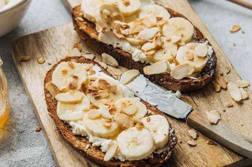 Тобі знадобиться: 2 шматочки хліба, 1 банан, 60 г сиру, 1 ст.л. меду, 10 г мигдальних пластівців.