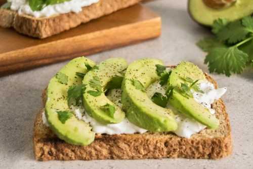 Приготування: Підсуши хліб на сковороді, змасти сирним сиром і присип спеціями. Зверху виклади листя салату та тонкі слайси авокадо. Прикрась бутерброди лимонними часточками.
