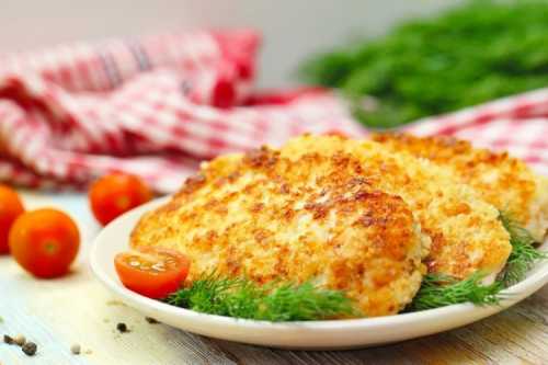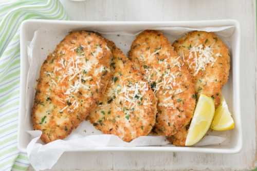 Приготування: Курячі грудки наріж товстими пластинами і відбий з обох боків. Пармезан натрій на тертці, дрібно наріж петрушку і кріп. Змішай сир, зелень та панірувальні сухарі. Яйце злегка збийте з перцем і сіллю. Припили м'ясо борошном, обмакни в кляр, виваляй у паніровці та обсмаж на розпеченій сковороді з маслом до рум'яної скоринки з обох боків.