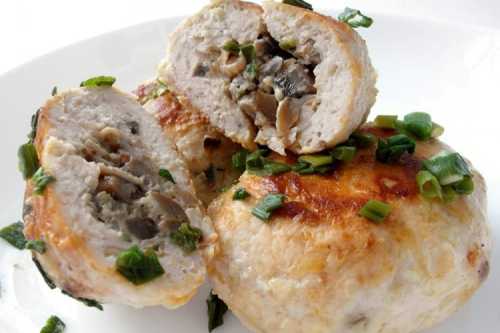 Приготування: Гриби та очищену цибулю дрібно наріж і обсмаж на вершковому маслі до готовності. Присип сіллю та спеціями, змішай з пропущеним через прес часником. Яйця злегка збий зі спеціями та сіллю. Куряче філе наріж товстими пластинами, загорни в харчову плівку і добре відбий. Виклади начинку на відбивні та загорни їх конвертиком. Обвалюй у борошні, вмокни в кляр і виваляй у панірувальних сухарях. Виклади курячий шницель з начинкою на застелене деко і запікайте 45 хвилин у духовці при 180 градусах.