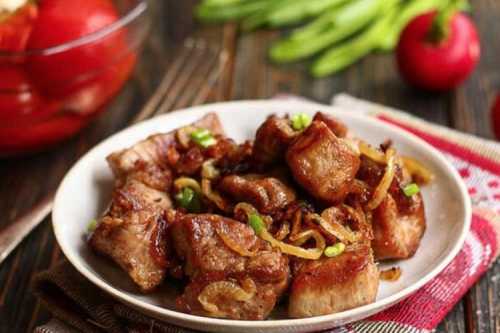 Приготування: Дрібно наріж сало і висмаж з нього весь жир в 1-2 ложках олії. Прибери сало зі сковороди, виклади нарізану свинину, присип спеціями і обсмажуйте до рум'яності, помішуючи. Додай нарізану цибулю і продовжуй смажити все разом до готовності.