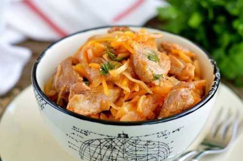 Тобі знадобиться: 300 г свинини, 1 цибулина, 1/2 качана капусти, 2 ст. томатної пасти, спеції.