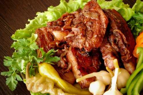 Тобі знадобиться: 400 г свинини, 100 мл червоного вина, 100 мл бульйону, 7 зубчиків часнику, 1 ч.л. цукру, спеції.