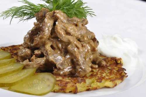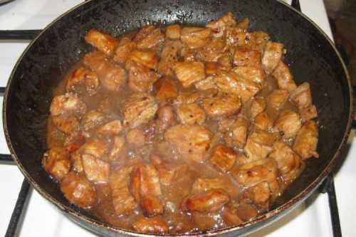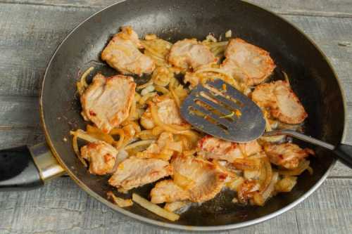 Приготування: Наріж свинину тонкими смужками, приправ і залиш на 20 хвилин. Обсмаж її порціями в один шар до рум'яності і відклади убік. Обсмаж цибулю на вершковому маслі до золотистості, додай томатну пасту і смаж ще 2 хвилини.