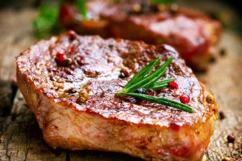 Свинину наріж на стейки бажаної товщини і присип всіма спеціями. Залиш їх на півгодини при кімнатній температурі і змасти маслом за допомогою пензлика. Обсмажити на сухій антипригарній сковороді з двох сторін по 3-5 хвилин.