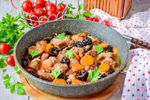 Тобі знадобиться: 600 г свинини, 100 г чорносливу, 1 цибулина, 1 морква, 2 зубчики часнику, спеції, 200 мл води.