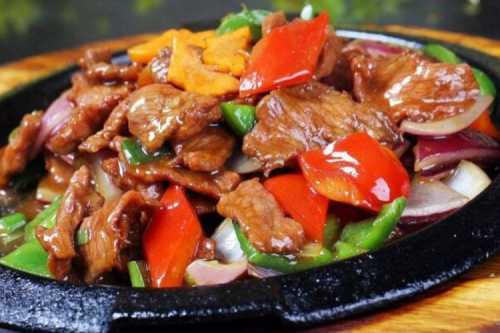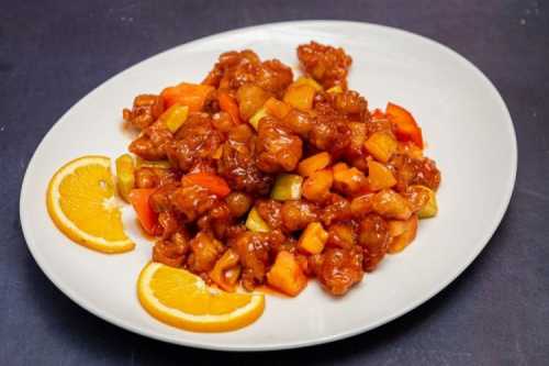 Приготування: Наріж свинину на відбивні, відбий і потім наріж смужками. Подрібни часник і чилі до смаку. Змішай соєвий соус, цукор, оцет, олію та спеції. Додай часник із чилі, зали свинину цим соусом, додай крохмаль і ретельно перемішай. Залиш свинину на півгодини і обсмаж її на сильному вогні разом з маринадом, помішуючи.