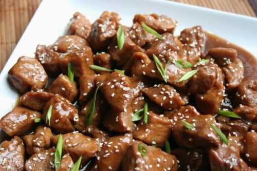 Тобі знадобиться: 400 г свинини, 80 мл соєвого соусу, 2 зубчики часнику, 2 ст. кунжутної олії, по 1 ст.л. цукру та рисового оцту, по 1 ч.л. крохмалю, імбиру, коріандру та спецій, перець чилі.