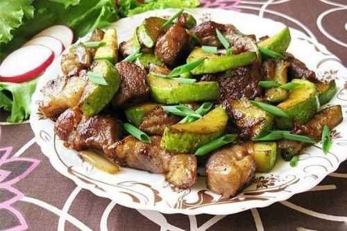 Тобі знадобиться: 450 г свинини, 2 цибулини, 1 кабачок, 1 зубчик часнику, 1 пучок зелені, по 4 ст. оливкової олії та бальзаміку, 1 ст.л. меду, спеції.