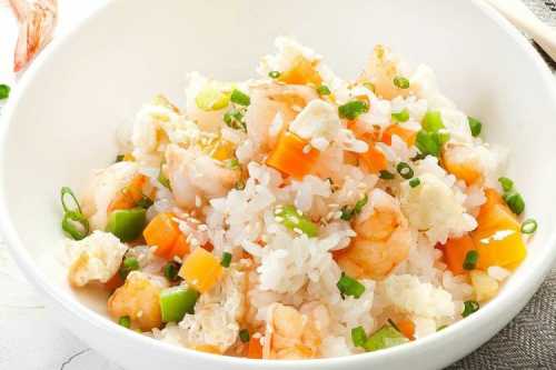 Тобі знадобиться: 1 склянка рису, 2 склянки води, 200 г моркви, 150 г болгарського перцю, 3 гілочки зелені, 200 г очищених креветок, спеції.