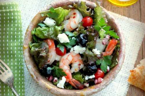 Тобі знадобиться: 6-7 великих креветок, 5 помідорів чері, 1 огірок, 50 г фети, 3 салатні листи, лимонний сік, оливкова олія, спеції.