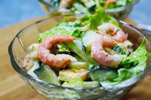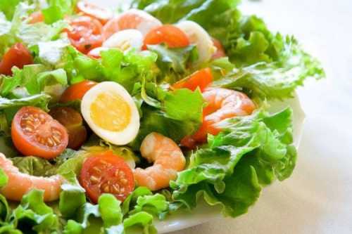 Приготування: Обсмажити креветки в мінімальній кількості олії зі спеціями. Відвари круто яйце і наріж його кубиком з огірком. Виклади все на салатне листя та полів йогуртом.