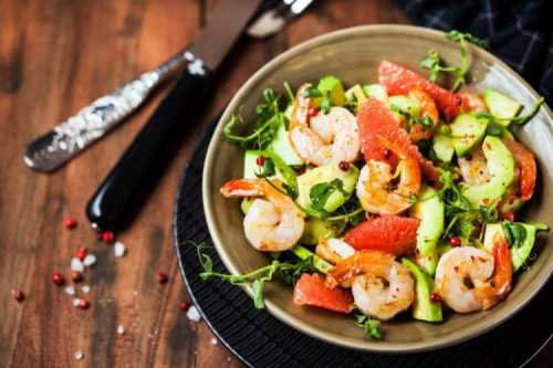 Тобі знадобиться: 100 г руколи, 100 г очищених креветок, 1/2 авокадо, 60 г грейпфрута, 5 помідорів чері, лимонний сік, оливкова олія, спеції.