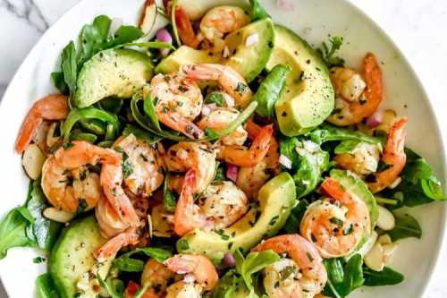 Приготування: Відвари до готовності та очисти креветок. Наріж авокадо кубиком, подрібни фіолетовий лук і змішай все разом. Заправте оливковою олією, лимонним соком і спеціями до смаку.
