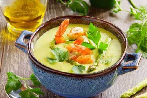 Тобі знадобиться: 200 г креветок, 500 г кабачків, 700 г броколі, 300 г цвітної капусти, 75 мл кокосових вершків, спеції, 1,2 л води.