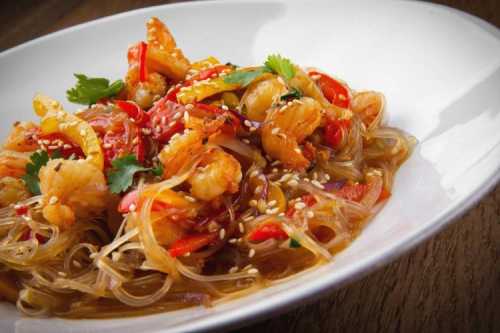 Приготування: Відвари фунчозу за інструкцією. Наріж печериці пластинками, обсмаж їх до золотистості і додай рубану зелену цибулю. Жар ще 2 хвилини. Додай очищених креветок і смажу ще 1-2 хвилини, а потім виклади фунчозу, влий соєвий соус, мед і оцет, приправ, протушкуй все ще 1 хвилину і зніми з вогню.