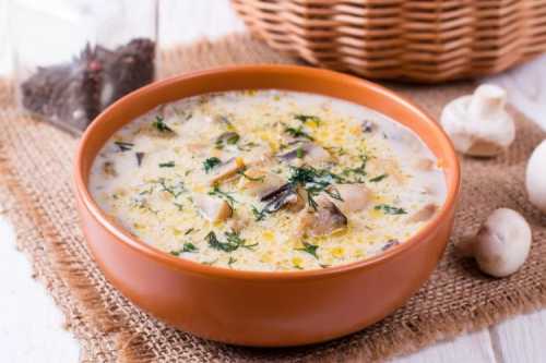 Приготування: Наріж всі овочі середніми шматочками. Обсмаж цибулю з морквою на вершковому маслі, додай печериці та готуй до випаровування рідини. Закип'ятіть воду, додай нарізану картоплю та засмажку. Вари суп близько 15 хвилин на слабкому вогні, влий молоко, приправ і провари ще 5-7 хвилин.