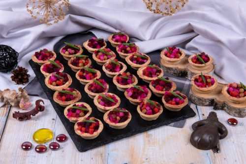 Вінегрет – дуже яскравий салат, тому буде вигідно виглядати у тарталетках.