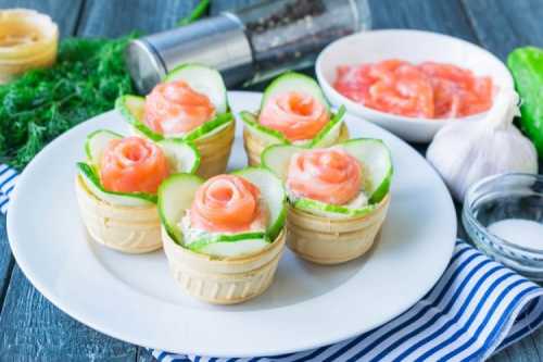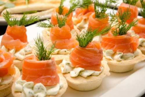 Приготування: Змішай сирний сир з рубаною зеленню і виклади начинку в тарталетки. Згорни трояндочки з тонких слайсів червоної риби і додай зверху.