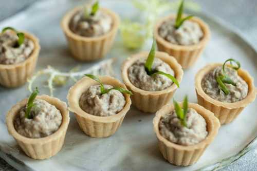 Приготування: Довільно наріж цибулю та моркву, обсмаж їх до м'якості, додай курячу печінку та смажу до готовності. Приправте, подрібніть паштет блендером і змішайте його з м'яким вершковим маслом. Виклади масу в тарталетки і подавай до столу.