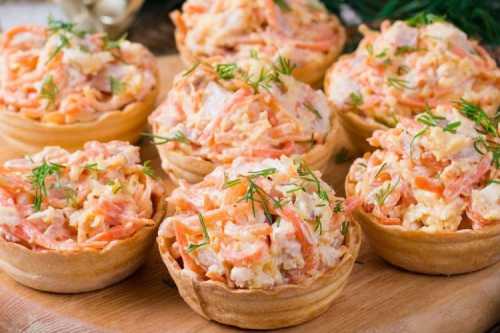 Приготування: Відварити або запікати курку, розбери її на волокна. Натрій сир на тертці і змішай все з корейською морквою та майонезом. Виклади начинку в тарталетки.