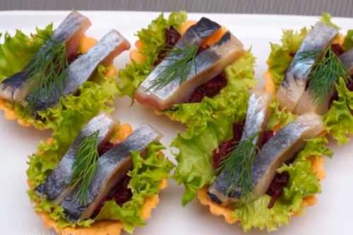 Приготування: Запекти або відварити буряки до готовності, натріть їх на тертці і додати часник. Злегка змасти тарталетки майонезом, виклади шматочки салатного листя і на них – буряки. Зверху розклади скибочки оселедця.