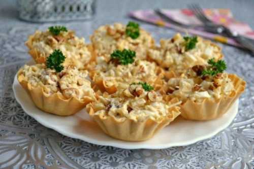 Приготування: Подрібни часник, зелень і горіхи, натрій сир на тертці, розімни сир виделкою і змішай все зі сметаною. Розкладіть готову начинку в тарталетки.
