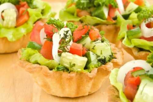 Приготування: Наріж дрібним кубиком огірок, помідор і сир, і заправ все маслом із лимонним соком та спеціями. Виклади в тарталетки шматочки листя латуку та салат.