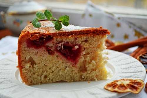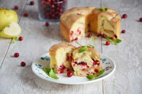 Приготування: Збийте яйця з цукром і сіллю. Додай молоко, просіяне борошно, розпушувач і перемішай тісто. Всип подрібнене яблуко, брусницю і очищену від кісточок вишню. Виклади все в застелену форму і випікай шарлотку 30 хвилин|мінути| в духовці при 180 градусах.
